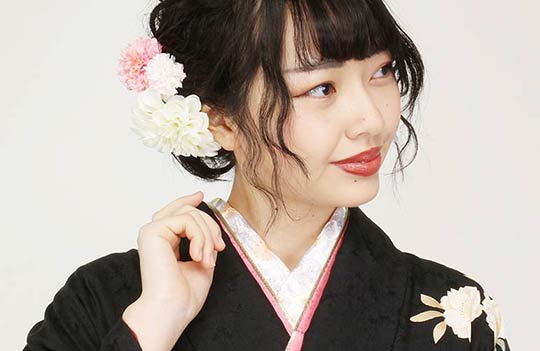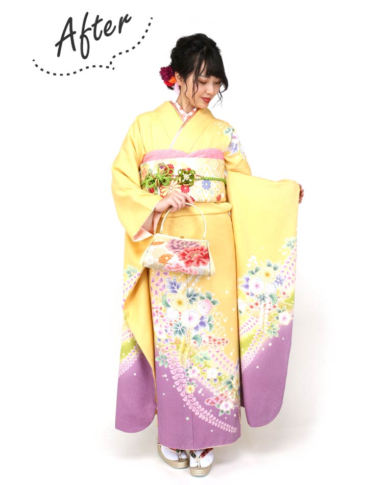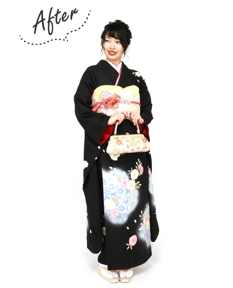着物の色合いに合っているようで合っていない同系色…。この着物ならではの絶妙な色彩を殺してしまっている。 フラットなデザインのバッグは振袖の華やかさに負けてしまっている。 重厚感のあるデザインの振袖に対して帯やほかの小物が格を下げている印象に…。 帯と草履バッグに正絹・黒地をセレクトすることでメリハリをつけて。黒色のベースにも金糸や色絹糸が織り込まれて贅沢な印象を確立。 差し色として、古典柄になじみやすい橙色、黄色を少々。古典柄の重厚感の中にもぱっと華やぐ小物づかいに。