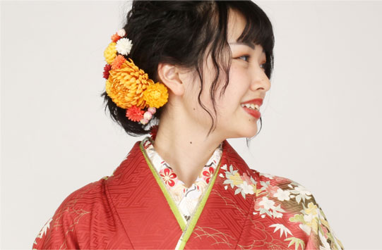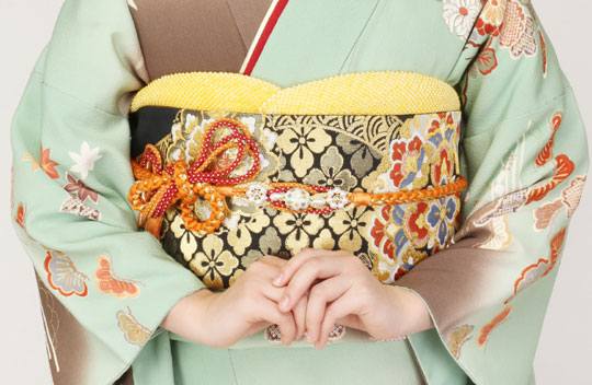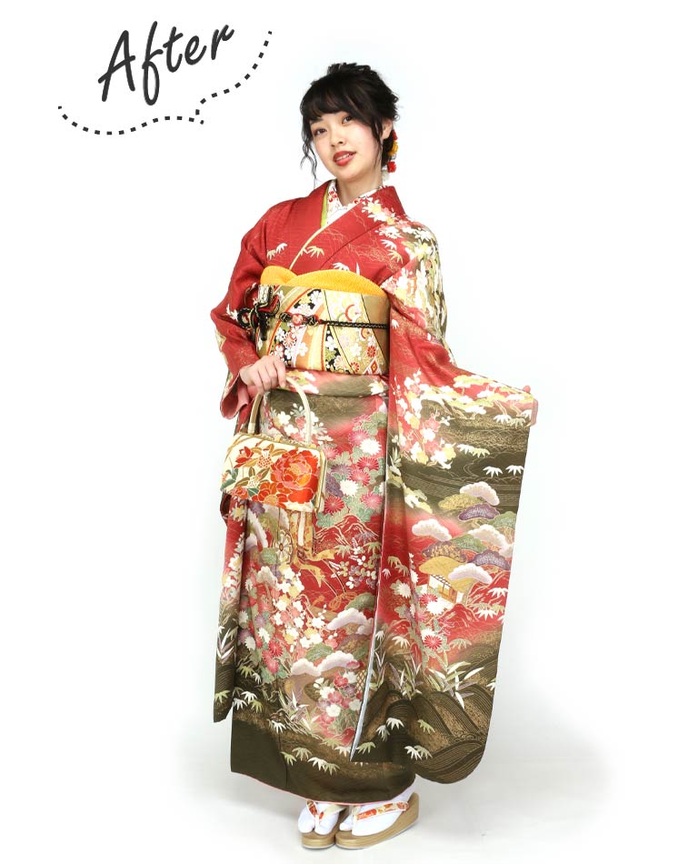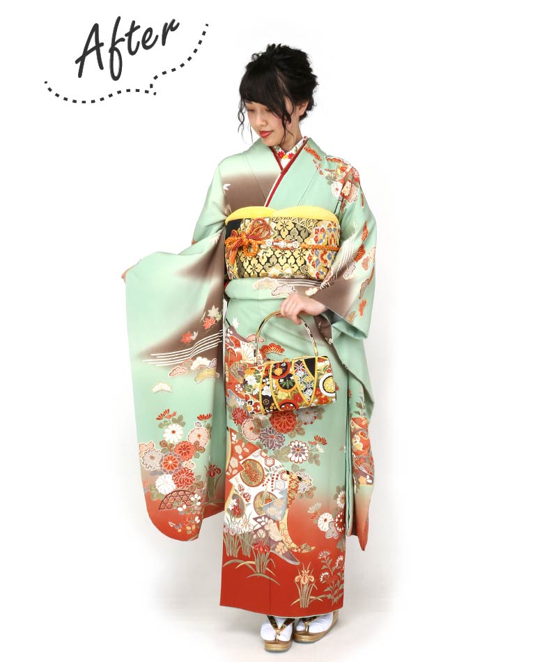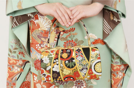 「着物にも緑色があしらわれているから」とグリーン系で小物を揃えたものの、着物と色調が合わず、かえって浮いてしまう印象に。 ゴールドのバッグはシンプルすぎて、豪華な振袖に合わせるには少し物足りない…。 着物に合わせて選んだ帯も馴染みすぎて印象に残らなくなってしまった。 昔ながらの古典柄の着物には朱色、橙色、黒色などのなじみカラーをセレクト。大胆な柄行きを選べばなじみながらもモダンな華やかさに。 振袖が持つ重厚感に細部までこだわった小物で、一生モノの晴れ姿に。