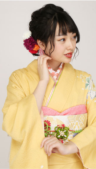 「華やかになれば」と小物は赤色を選んで統一したが、他の色がない分単調なコーディネートになってしまった。 これといった特徴のない草履、足元のおしゃれも楽しめたらいいのに…。 黄色の着物に黄色の帯を合わせたため締まりのない帯元になってしまった。 柔らかいパステルカラー、発色のいいレディーカラー、着物いっぱいの花々の色を小物にもふんだんに取り入れて。 着物に負けないくらい大きな牡丹が咲くバッグ、美しい着姿を演出する三枚芯草履、持ち物にも足元にもときめくポイントをちりばめる。