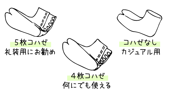 当店の足袋には、「5枚コハゼ」「4枚コハゼ」「コハゼなし」があります。